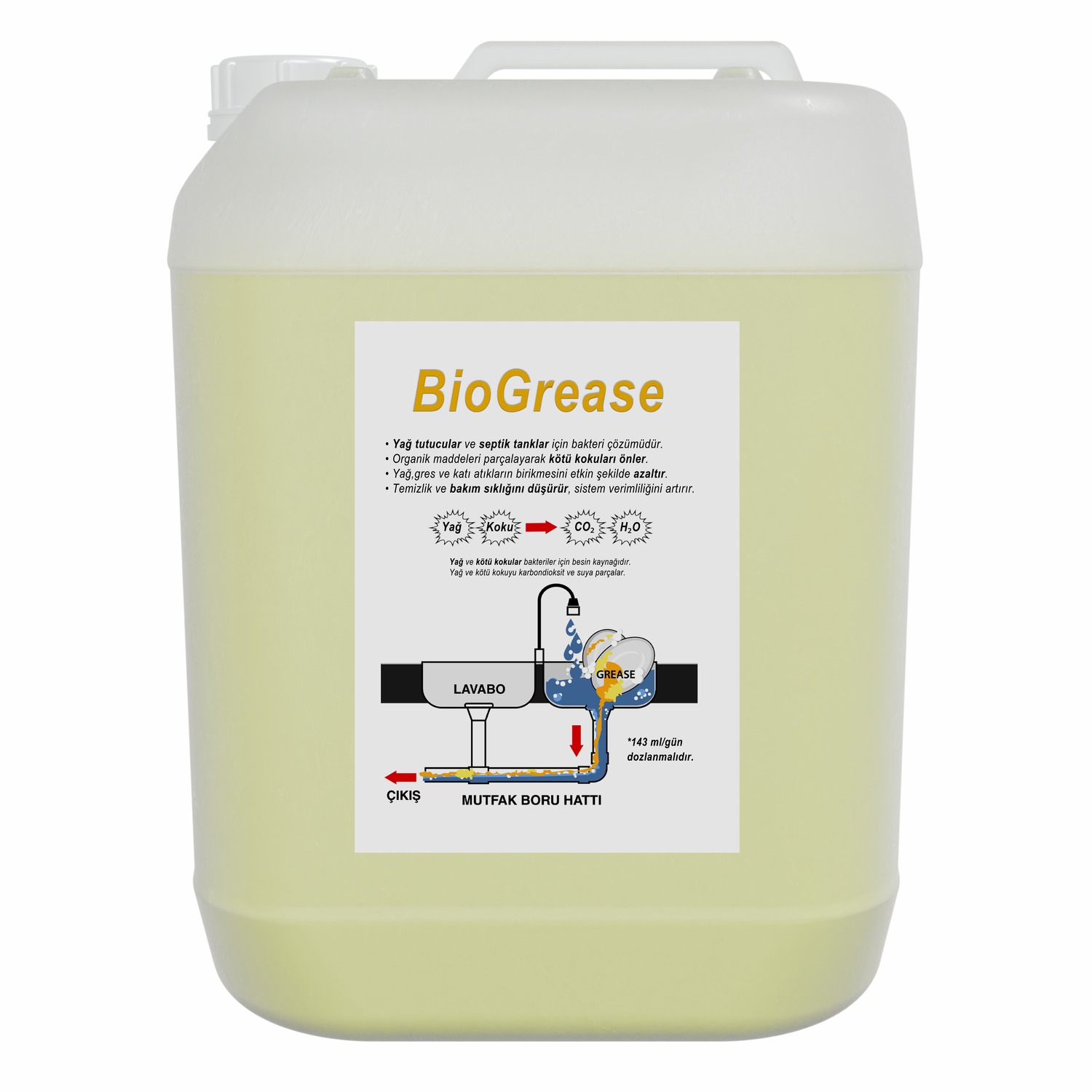 - 20 litrelik yüksek kapasiteli bakteri çözümümüz, 3 ila 10 litre/saniye debi kapasitesine sahip büyük yağ ayırıcı sistemlerde etkin kullanım için geliştirilmiştir. Gıda üretim tesisleri, büyük oteller, alışveriş merkezleri ve yoğun kapasiteli endüstriyel mutfaklarda biriken yağ, gres ve organik atıkları biyolojik olarak parçalayarak kötü kokuları kaynağında yok eder. Doğal ve kalıcı çözümü sayesinde sistemin temizliği sağlanır, bakım aralıkları uzar ve yağ ayırıcı sistem uzun ömürlü şekilde verimli çalışır.