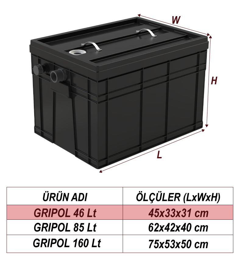 - GRIPOL 0350, küçük işletmeler ve bireysel kullanımlar için geliştirilmiş, kompakt ve yüksek verimli bir yağ ayırıcı sistemidir. 0,35 lt/sn debi kapasitesine sahip olan bu model, atık sularda bulunan yağ ve gresleri etkin şekilde ayrıştırarak gider hatlarının korunmasına yardımcı olur ve tıkanmaların önüne geçer.