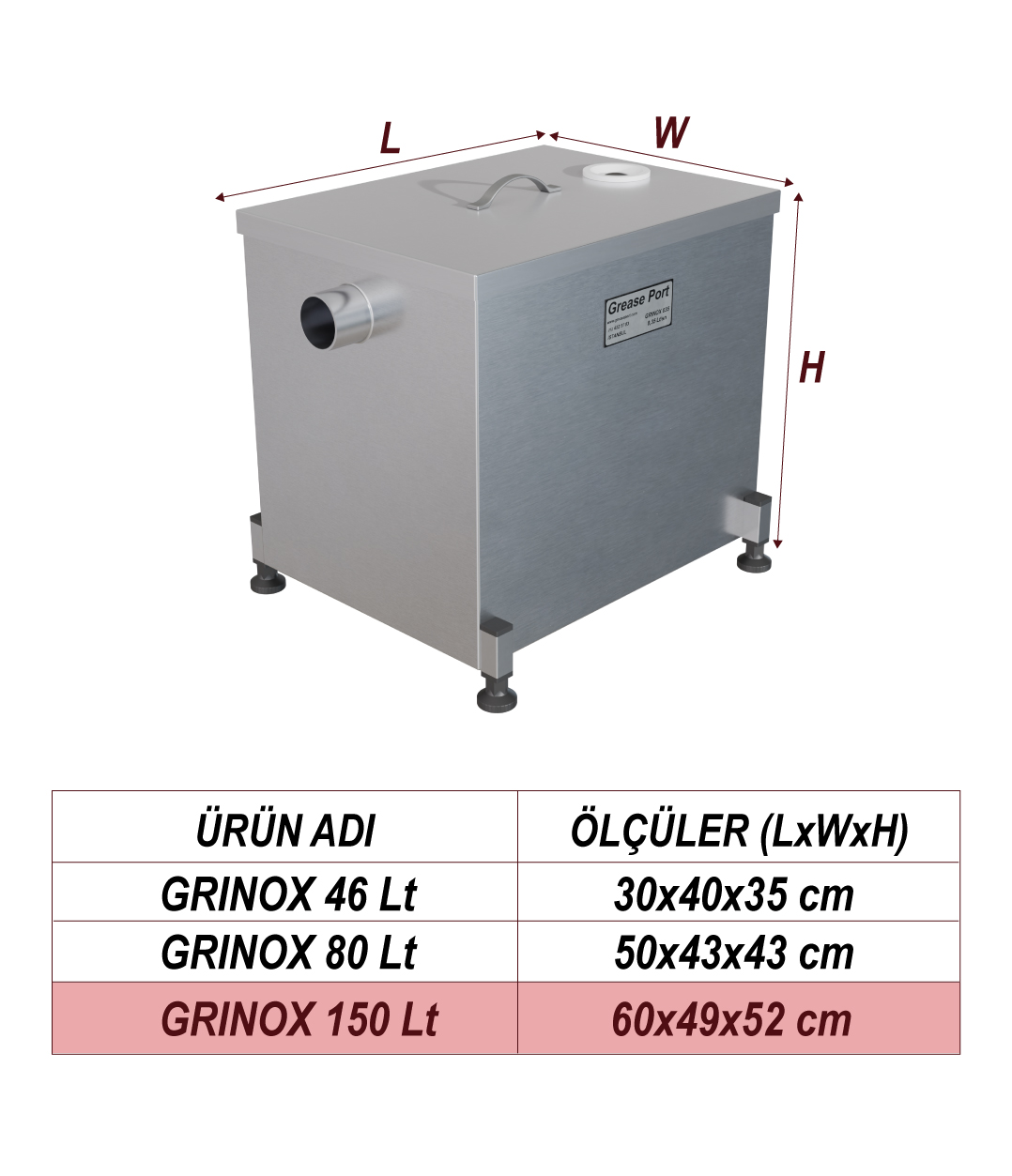 • GRINOX 0900, yoğun trafiğe sahip büyük mutfaklar, endüstriyel mutfaklar ve yüksek kapasiteli işletmeler için özel olarak tasarlanmış, güçlü ve yüksek verimli bir yağ ayırıcı sistemidir. 0,90 lt/sn debi kapasitesi ile atık sularda bulunan yağ ve gresleri etkin şekilde ayrıştırır; böylece gider hatlarının korunmasına ve sistemin kesintisiz şekilde çalışmasına katkı sağlar.